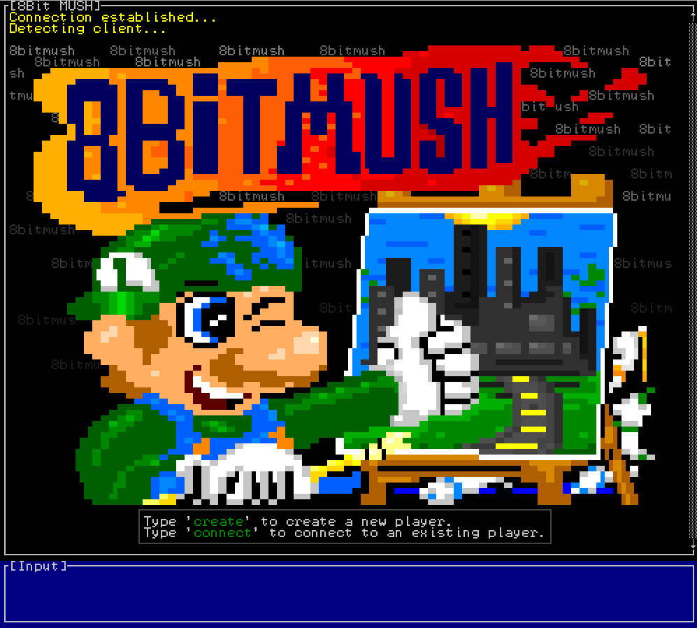 Title screen from 8bitMUSH running at 8bit.fansi.org 4201 showing ASCII compatibility mode from [1]