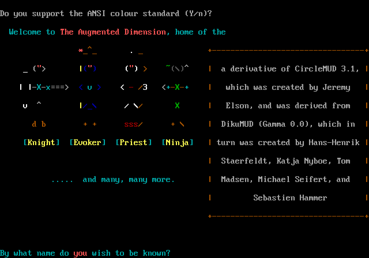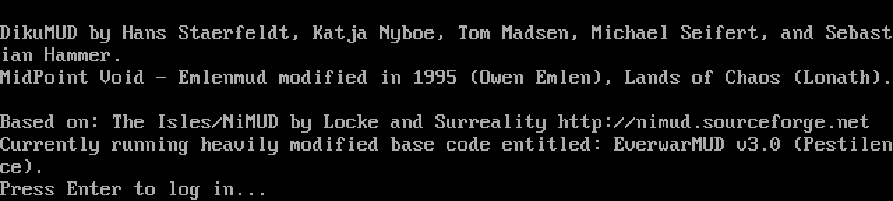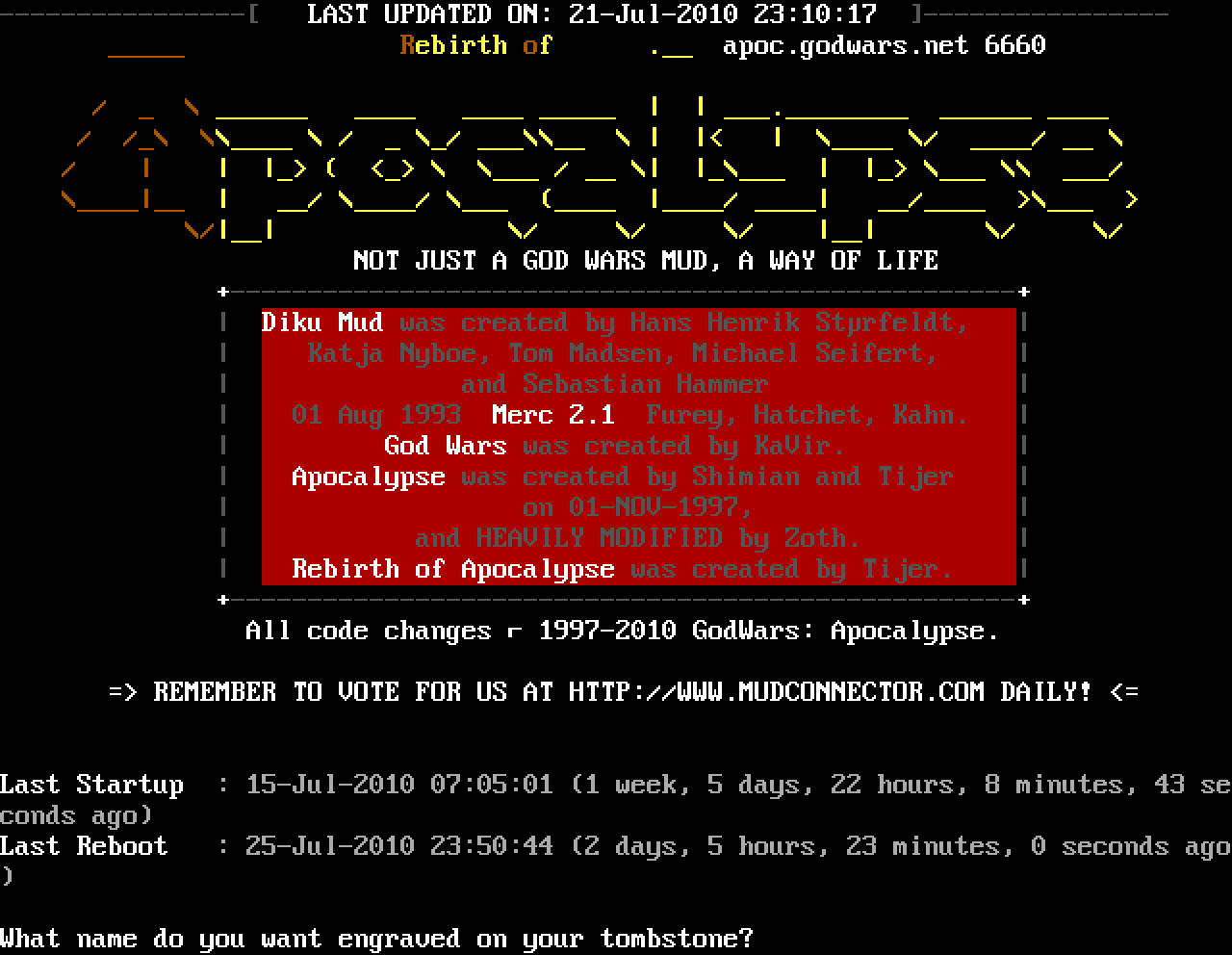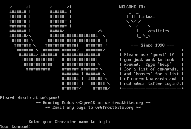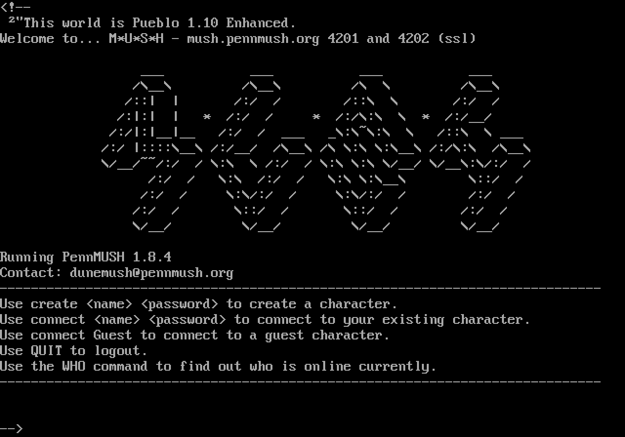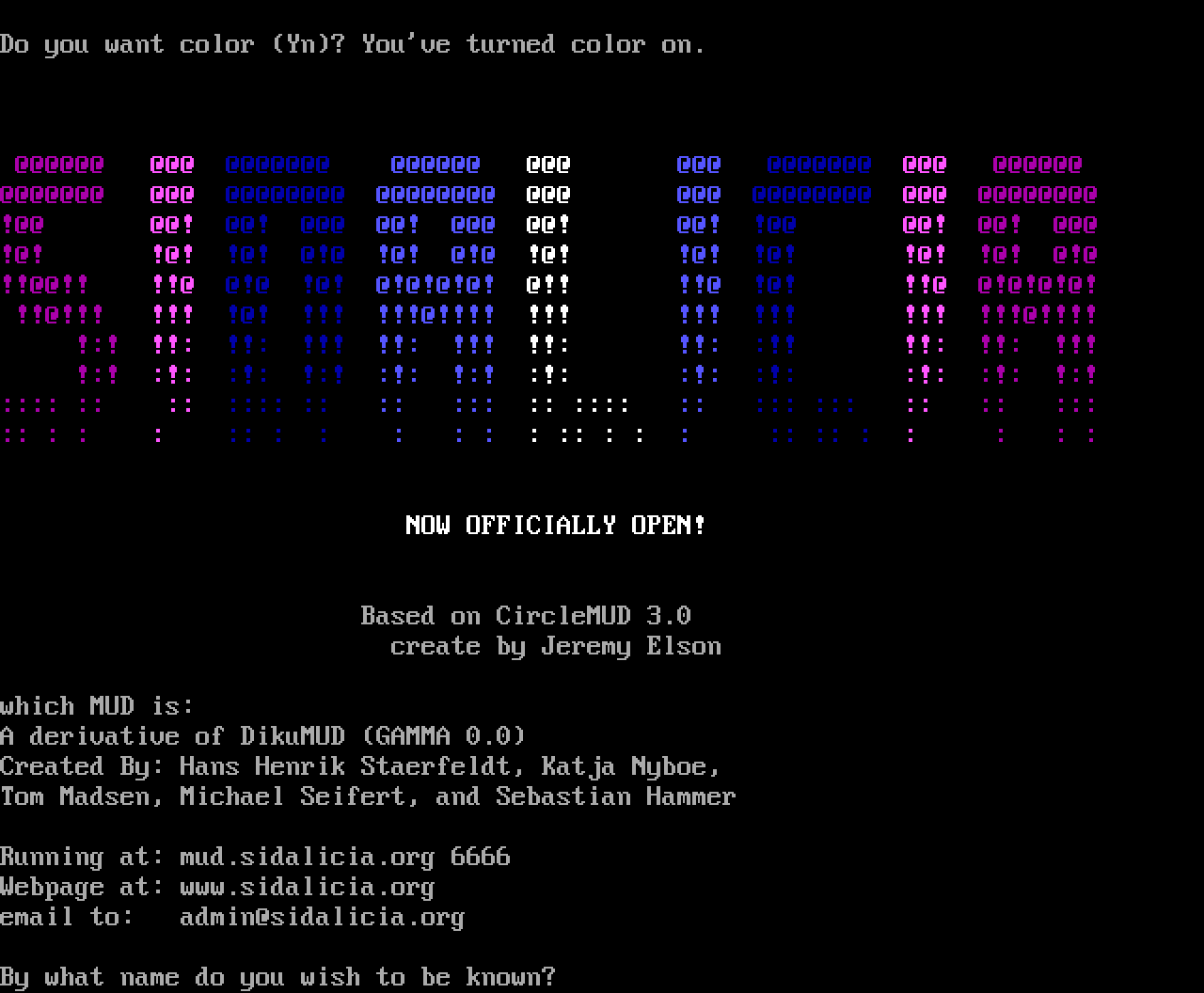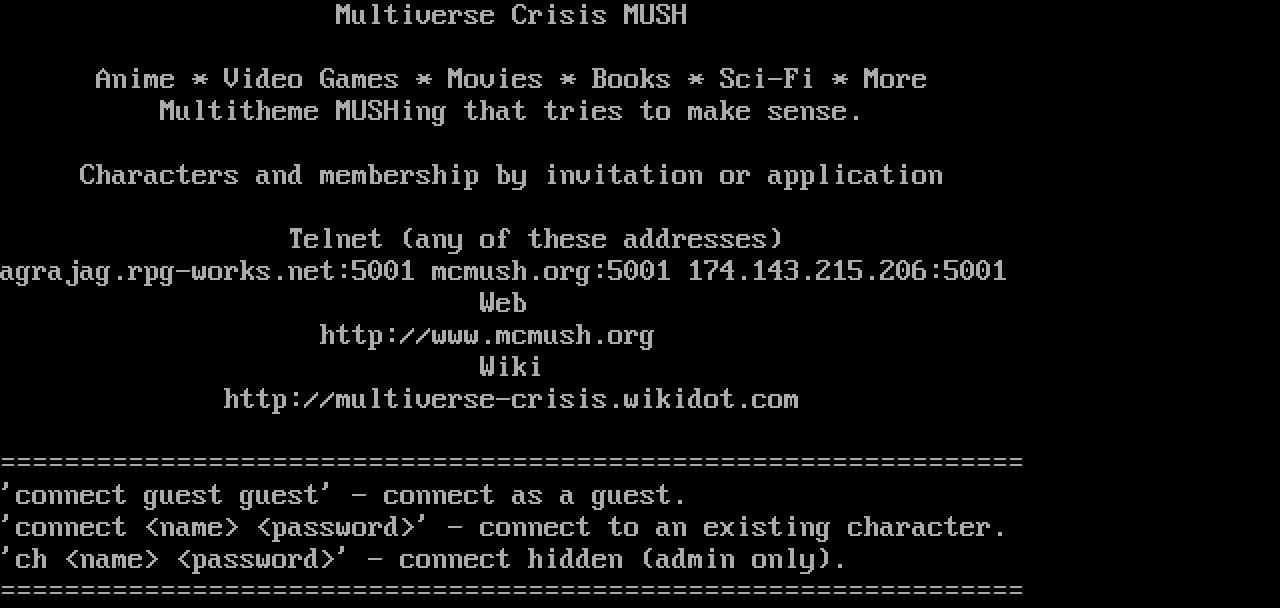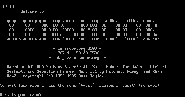 The following MU front door snapshots were taken by Webmudlister starting in 2013. Feel free to include them in your MU listing pages. View the source of this page and search for the domain name or IP address to locate in the list quickly. Of note, it is sorted A-Z based on its IP/Domain.