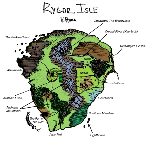 Rygor Isle itself is far removed from the happenings north, and is a highly-detailed microcosm of a fantasy world. On Rygor Isle there are four major cities: Kess, the capital, Cape Red, the trader's hub, Keveg, the wine-country, and Ostinbrun, the farmer's haven. Characters can travel between the city by crossing the countryside, which involves traversing various types of terrain (forests, rivers, mountains, foothills, desert, marsh and wastelands).